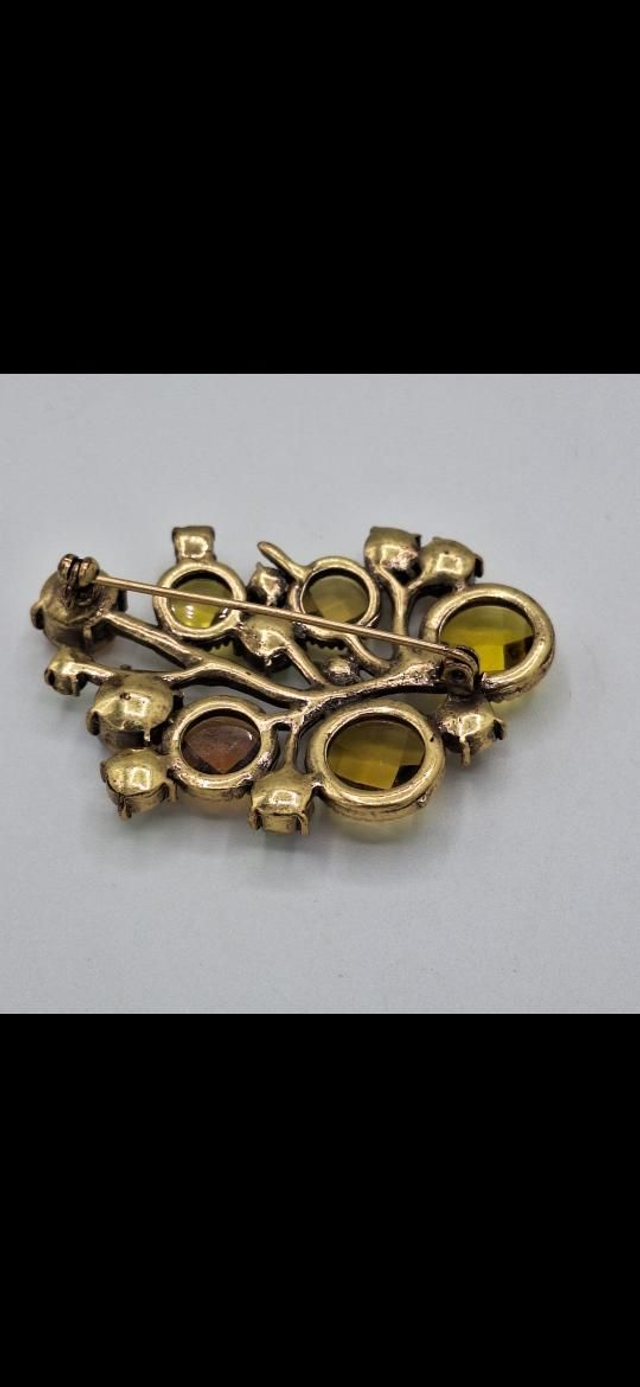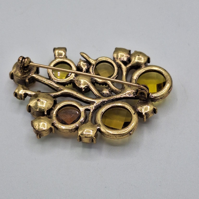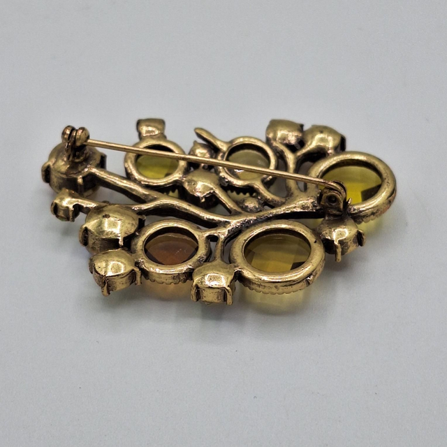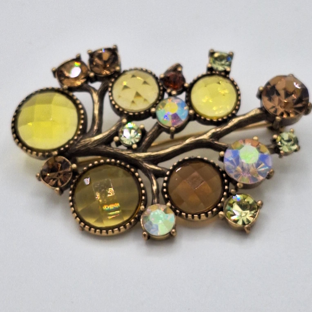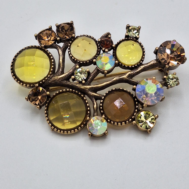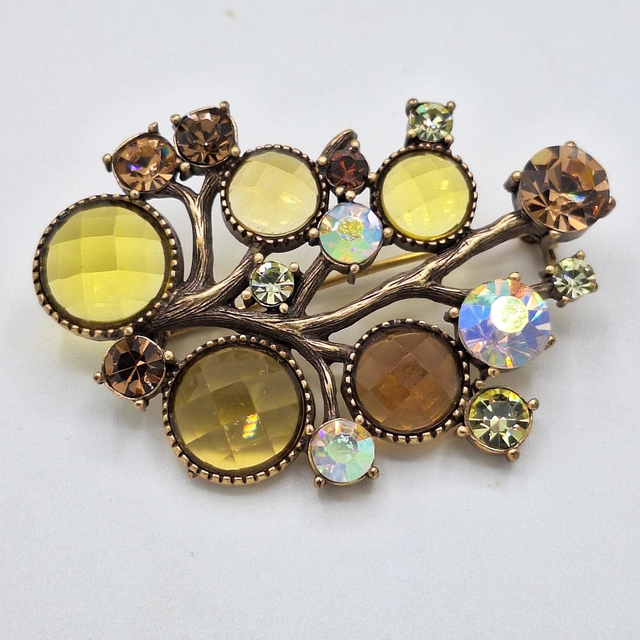 Ausgefallene Brosche in Form eines stilisierten Baumes, besetzt mit facettierten Glassteinen in warmen Gelb-, Braun- und AB-Tönen. Die detailreiche Bronzeoptik macht sie zu einem besonderen Blickfang – ideal für Jacken, Schals oder Hüte.